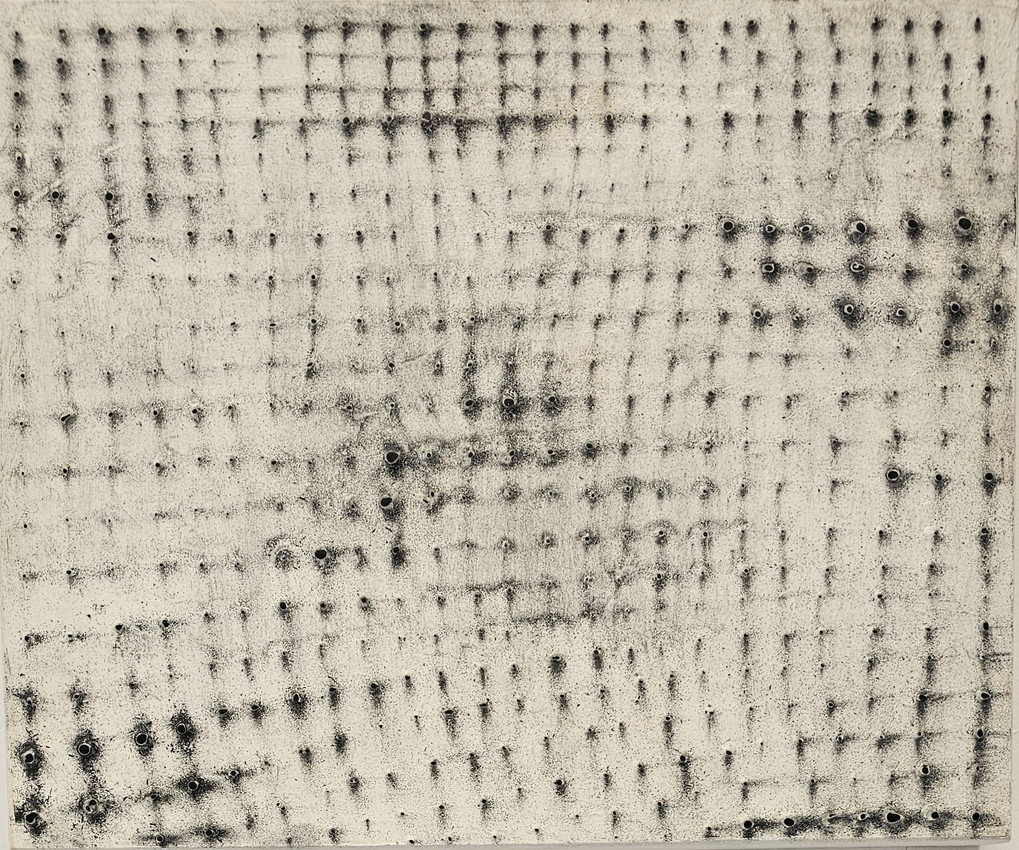 Las composiciones integran choques formales —colisiones, cortes, vacíos— dentro de un equilibrio vivo y dinámico, proponiendo una pintura donde el espacio se convierte en tiempo.