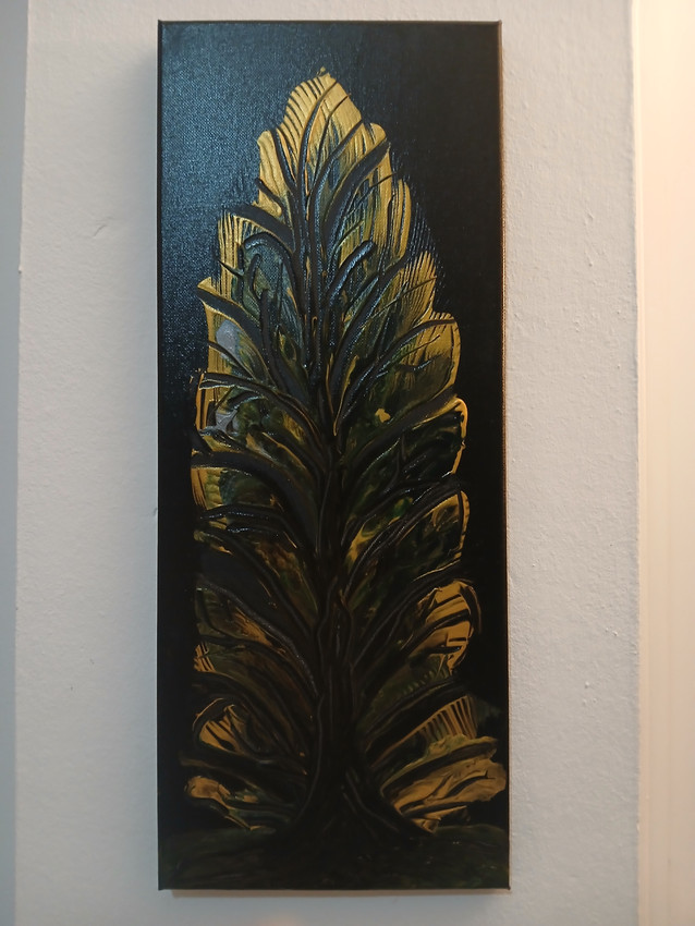 Obra original pintada en acrílico sobre lienzo en formato vertical (20x50 cm). Esta pieza destaca por su elegante composición en tonos negros profundos y dorados luminosos, creando un contraste sofisticado y moderno.