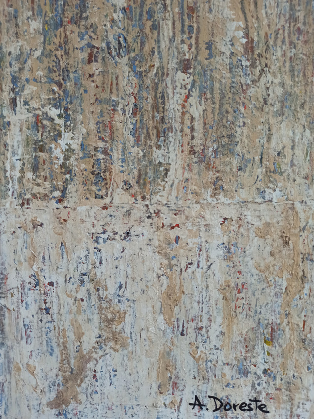 La obra es una pintura abstracta con una textura rica y una paleta terrosa, dominada por tonos beige, crema, ocres y grises, entre los que se filtran matices de azul, rojo y blanco. Está realizado con una técnica de pintura en capas y empastes gruesos, que genera un efecto de erosión o desgaste, como si la superficie fuera una pared antigua marcada por el paso del tiempo.