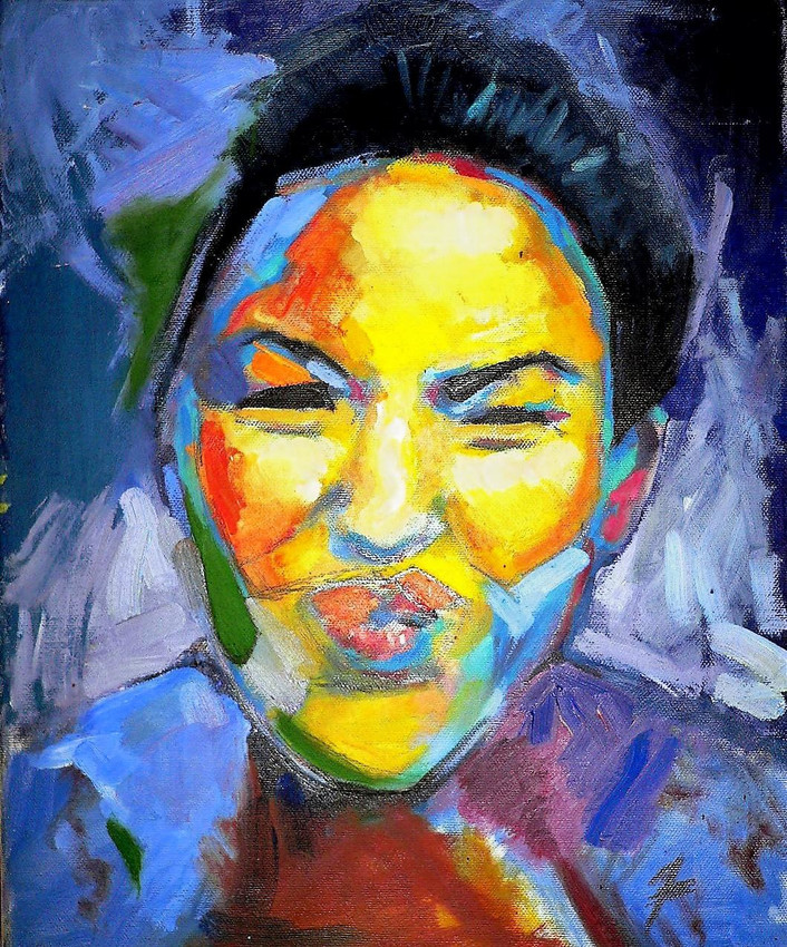 Una obra que captura la intensidad de una emoción a través de una explosión de colores. La expresión facial de la figura, cargada de energía y dinamismo, se mezcla con pinceladas audaces que parecen transmitir una sensación de sorpresa, alegría o desafío. La paleta vibrante de amarillos, naranjas, azules y morados destaca la fuerza del retrato, haciendo que la figura sea casi palpable. Ideal para quienes buscan arte contemporáneo que celebre la expresión humana en su forma más emocional y colorida.