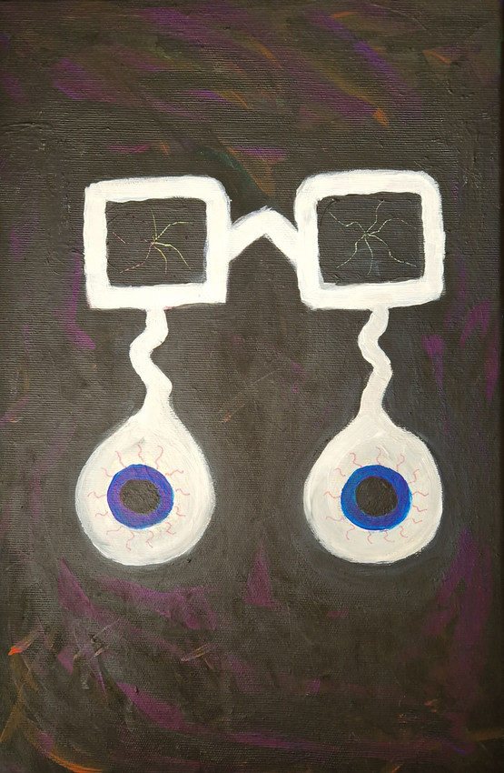 Fun fact? This painting was inspired by the thought: “What if denial had a physical form?” The broken lenses became the perfect metaphor for selective vision—how we all sometimes choose blindness when the truth feels too sharp.