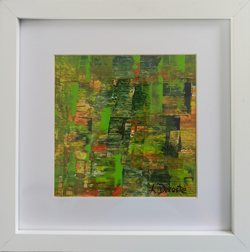 Ésta pintura se caracteriza por la superposición de tonos verdes intensos con pinceladas rectangulares y verticales que parecen flotar sobre un fondo texturizado en tonos tierra, naranjas y ocres. La técnica sugiere movimiento y dinamismo, como si fueran fragmentos de naturaleza comprimida en geometrías irregulares.