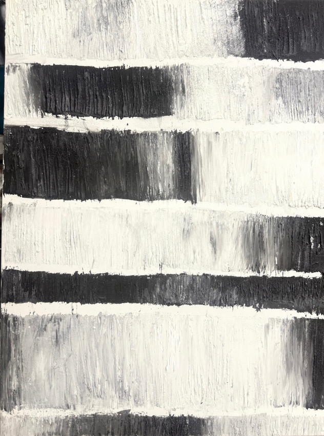 Mi obra de técnica mixta, "Geometría en blanco y negro", utiliza acrílicos y materiales orgánicos para explorar la tensión entre el orden y el caos. Las marcadas rayas horizontales representan un marco estructurado, mientras que la aplicación texturizada y las sutiles variaciones de tono insinúan la naturaleza impredecible de la realidad, alterando sutilmente la estricta geometría. Es una meditación visual sobre la interacción entre el control y la espontaneidad.