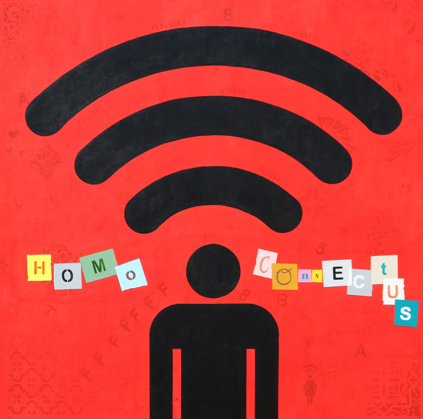 Unión de dos imágenes muy populares: El icono de MEN de los W.C. y el de WIFI, que, sumados al título, visible en la pintura, "Homo connectus" nos invita a reflexionar sobre el individuo ultraconectado.