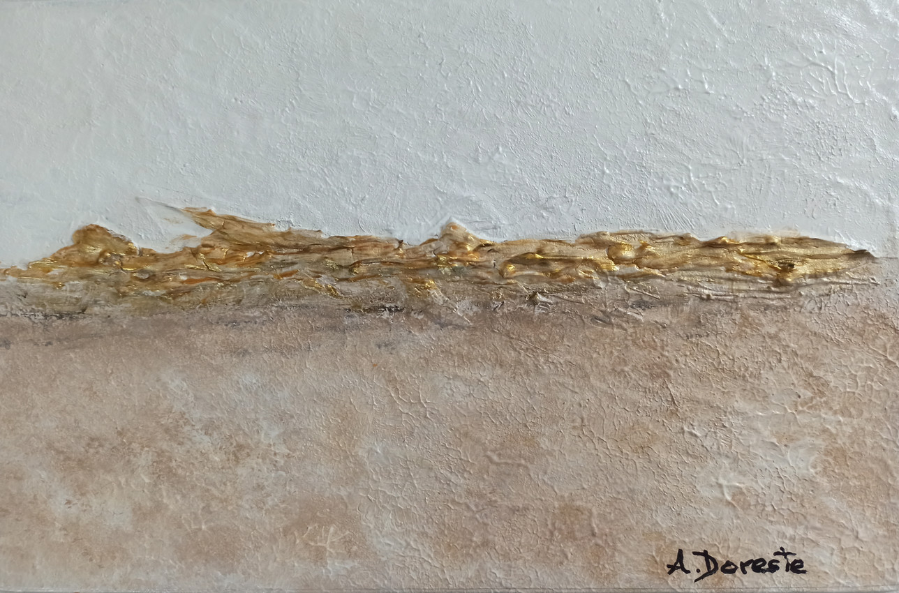 Una franja dorada emerge entre la calma del blanco y la textura terrosa inferior, evocando un horizonte donde la luz se encuentra con la tierra.