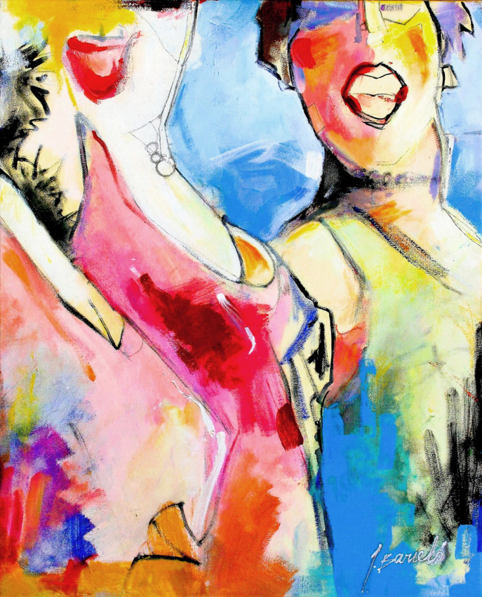 Se trata de un cuadro de dos mujeres hablando por las paredes.