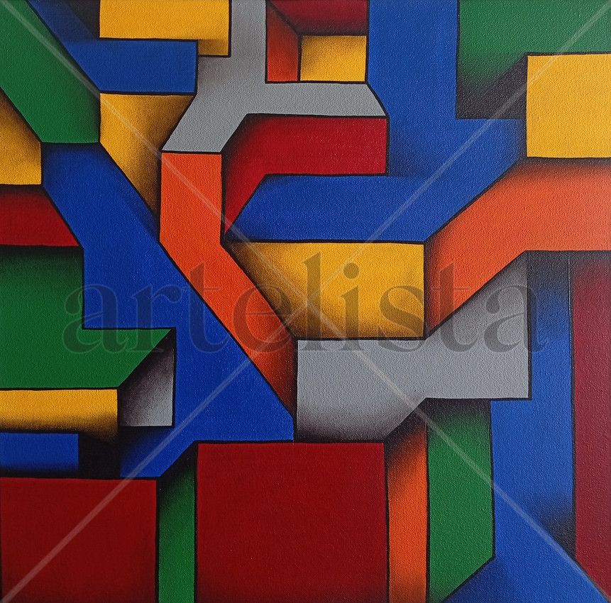 "Luz y color" es una obra de arte vibrante y dinámica que capta la esencia del movimiento constructivista. Esta pieza presenta una intrincada red de formas geométricas entrelazadas, utilizando una paleta de colores primarios y secundarios. Las formas tridimensionales parecen flotar y encajar entre sí, creando una sensación de profundidad y volumen, con sombras y degradados que añaden una dimensión adicional.