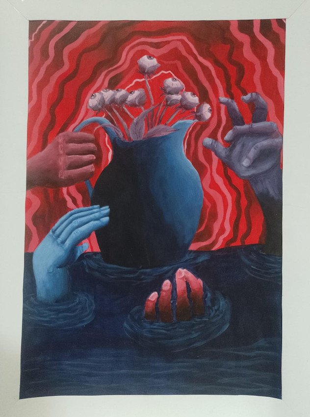 obra surrealista, con colores primarios y uno secundario. obra propia de una universitaria de Artes.