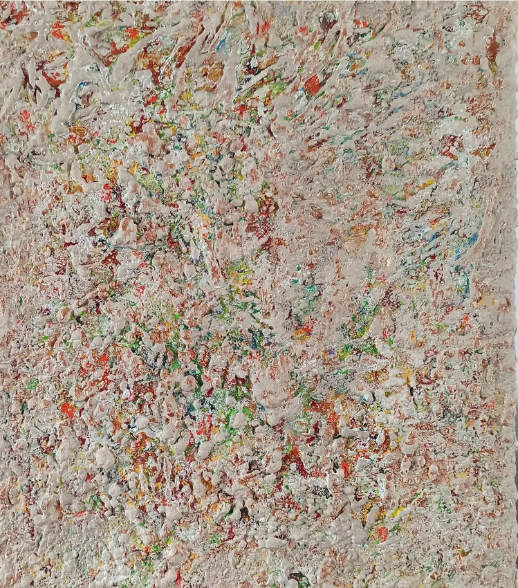 Predomina un tono terroso o beige claro, que recubre gran parte del lienzo, pero de entre él emergen destellos vivos de color —rojos, verdes, amarillos, azules y naranjas— que se filtran como chispazos de energía atrapados bajo la superficie. Esta interacción entre lo áspero y lo vibrante da la sensación de un caos orgánico, como si la naturaleza misma tratara de abrirse paso desde dentro de una costra.