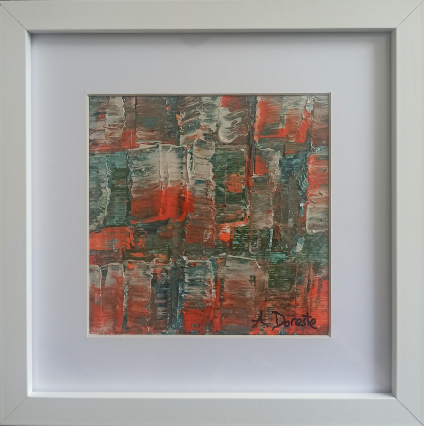 Este cuadro es una pieza de arte abstracto en técnica de espátula, con predominancia de tonos verdes, naranjas, rojizos y blancos. Las pinceladas son cortas, gruesas y superpuestas, lo que genera un efecto de textura y profundidad. La composición sugiere un entramado de bloques o estructuras que se entremezclan, evocando tanto un paisaje urbano visto de cerca como un mosaico orgánico en movimiento.