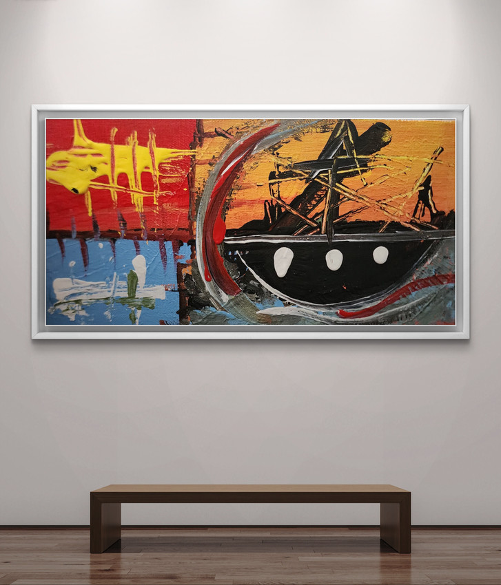 Obra cargada de simbolismo gestual, en la que se sugiere la figura de un barco o nave como metáfora de la lucha interna y el desplazamiento espiritual. La paleta cromática —con rojos intensos, azules fríos, amarillos eléctricos y negros dominantes— crea un contraste dramático que refuerza el movimiento y la tensión narrativa. El trazo enérgico y las formas fragmentadas evocan un tránsito emocional entre el caos y la estructura, entre lo perdido y lo que aún se busca.