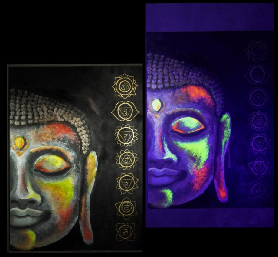 ---> La pintura Neón hace que los colores se vean mas intensos y con una cierta luminiscencia, al estar iluminados con luz UV y luces led. Con un variado de colores en luces led, se ven matices diferentes en la pintura haciendo que el cuadro vaya cambiando.