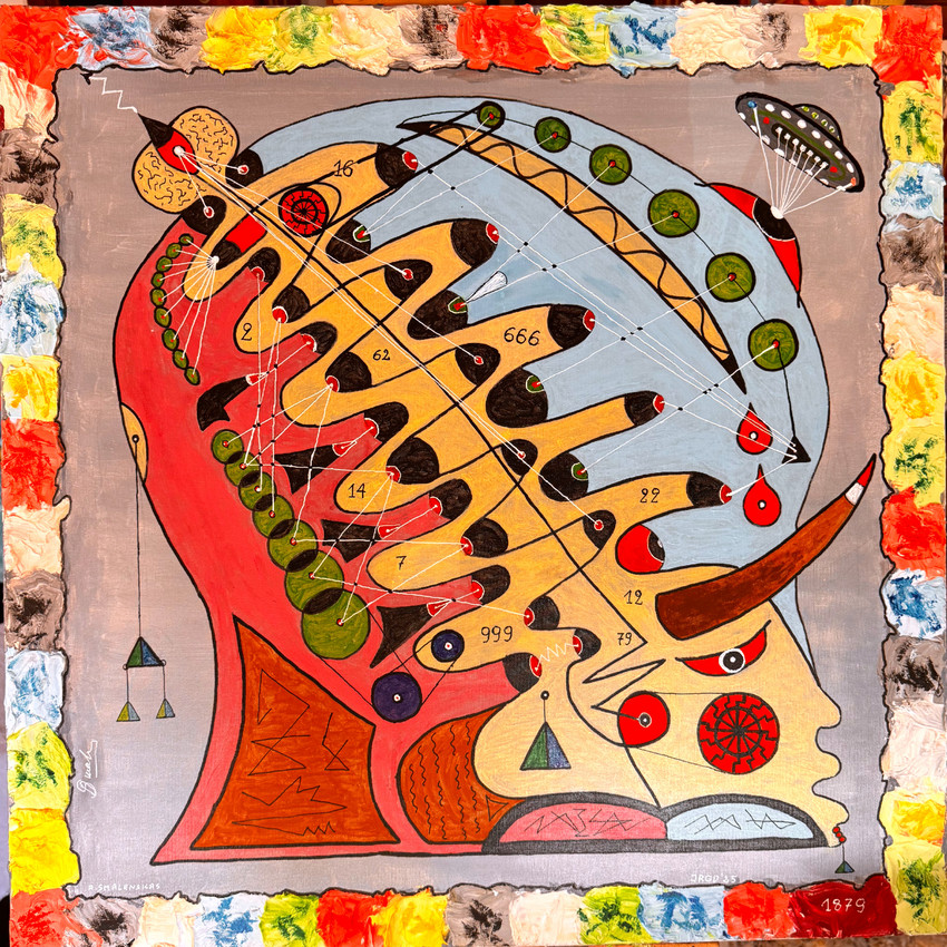 Este cuadro es una obra de estilo surrealista y simbólico, con una estética cercana al arte visionario o psicodélico. Predomina la sensación de estar observando un diagrama mental, cerebral o espiritual, como si la pintura quisiera representar procesos internos de pensamiento, energía o conciencia.