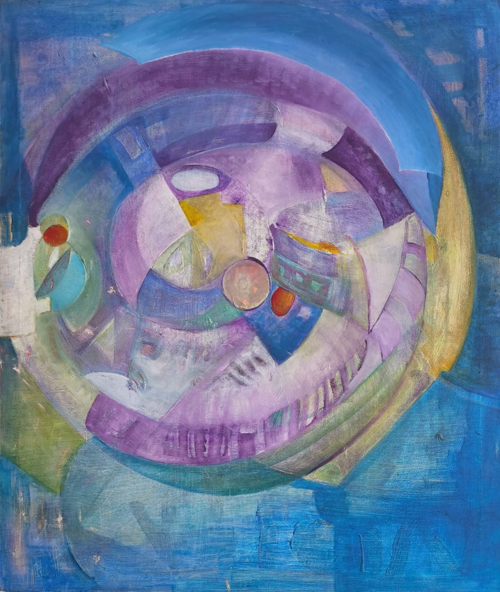 La paleta, dominada por azules profundos y violetas matizados con toques cálidos, genera una atmósfera serena pero dinámica. Las transparencias y veladuras aportan profundidad, mientras los acentos de color activan el centro visual y conducen la mirada en un recorrido fluido.