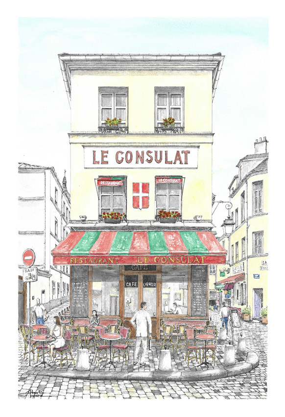 Dibujo del encantador café Le Consulat en el corazón de Montmartre, el barrio bohemio de París.