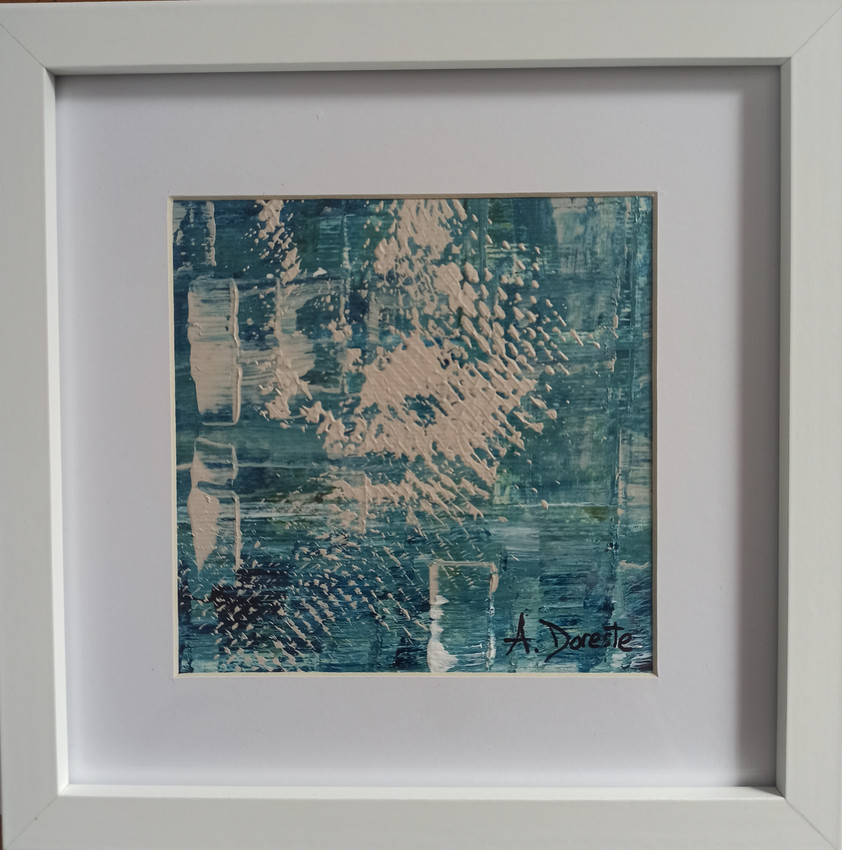 Este cuadro presenta una composición abstracta en la que predominan los tonos azules y turquesa, atravesados por pinceladas y texturas en beige claro. La superficie muestra un juego de relieves y direcciones, con líneas cruzadas y manchas que crean un efecto de dinamismo y profundidad. El contraste entre el azul frío y el blanco cálido genera la sensación de movimiento, como si fueran destellos de luz o reflejos en el agua.