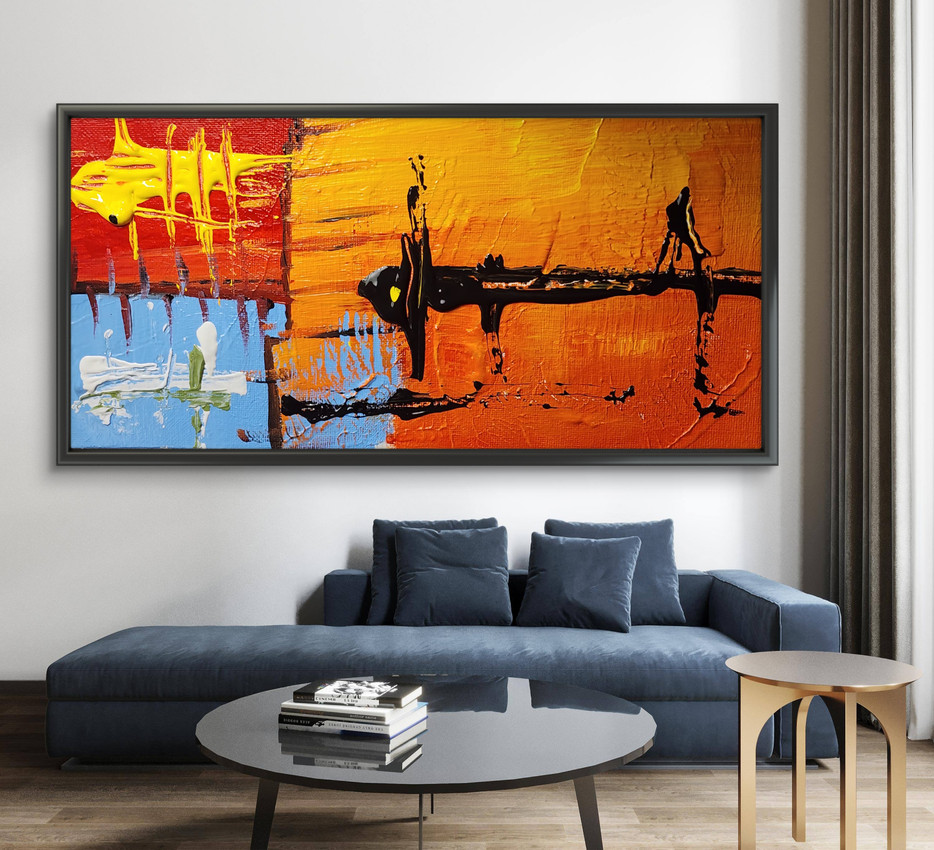 Obra de fuerte impacto cromático donde convergen campos de color vibrantes y gestualidad intensa. El amarillo, el rojo y el azul se funden en un diálogo visual que recuerda paisajes internos, fracturas emocionales y estructuras simbólicas. La intervención negra sugiere una figura central suspendida en un plano de tensión, marcando un contraste dramático entre lo instintivo y lo racional.