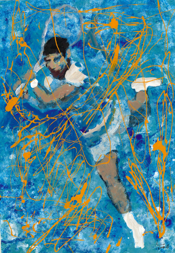 TENIS 01 pertenece a la serie Tenis 2025 que está realizada con técnicas propias de la pintura de acción. En papel pegado sobre cartulina, se utiliza la proyección de esmaltes, la transferencia por presión, la impresión de papel sobre papel...