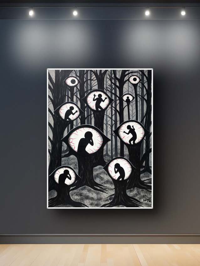 This painting uses the giant eyes in the forest and the lost figure to reveal two inner patterns: the people-pleaser and the controller.