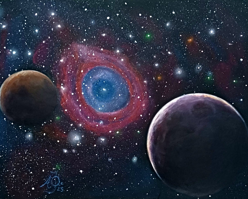 Esta pintura, titulada “Watcher of the Universe”, explora la vasta belleza y el misterio del espacio exterior. En el centro presenta una nebulosa vibrante y luminosa que recuerda a un ojo celestial, rodeada por dos planetas misteriosos y un mar de estrellas lejanas.