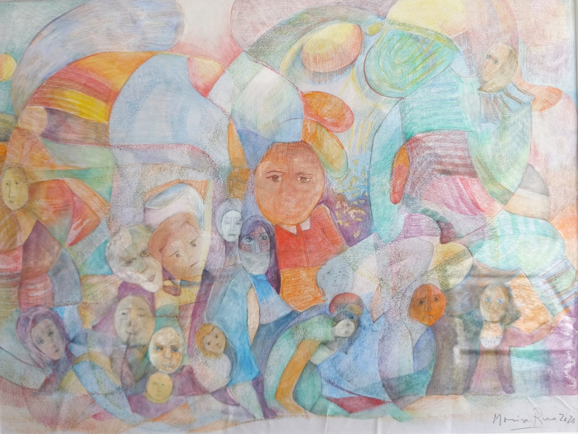 La paleta pastel, con matices en azules, verdes, rosas y ocres, aporta delicadeza y profundidad. Las transiciones cromáticas y las veladuras generan una atmósfera introspectiva, casi onírica, donde cada rostro transmite una historia, una memoria o una emoción compartida.
