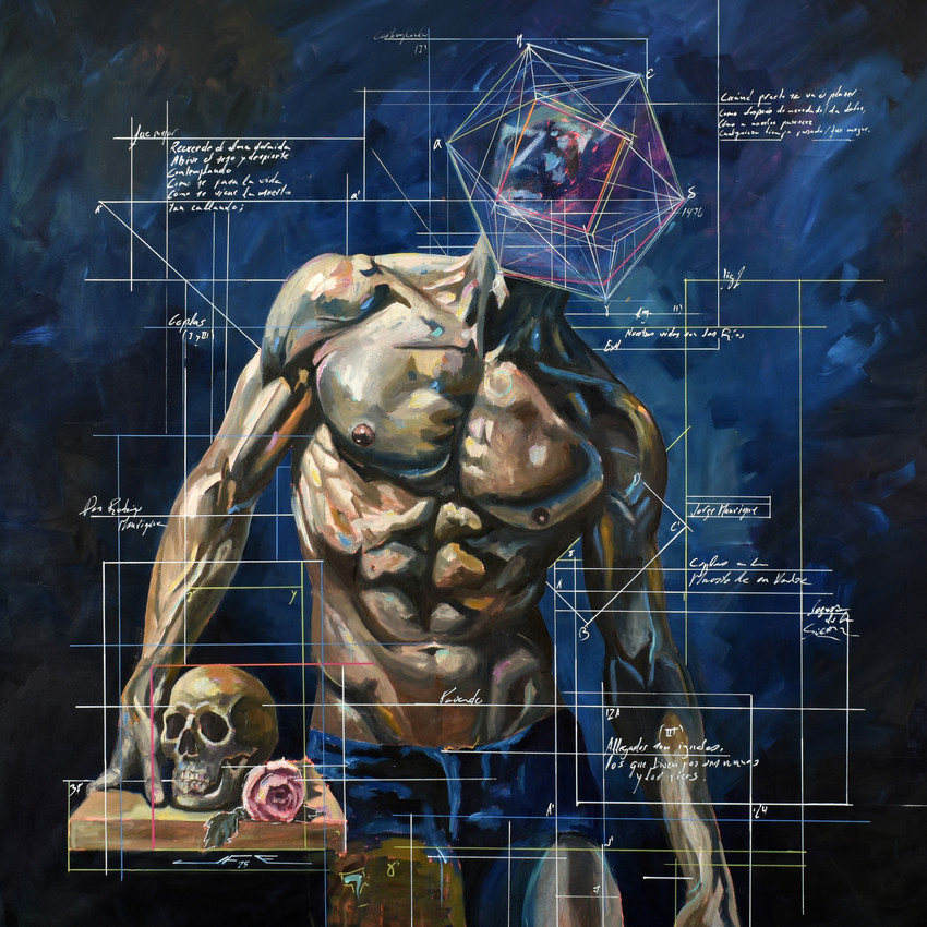 Inspirada en las coplas I y III de Jorge Manrique, esta obra plantea una meditación visual sobre la fugacidad de la vida y la necesidad de despertar la conciencia ante la certeza de la muerte. El cuerpo masculino, anatómicamente preciso y vigoroso, aparece sin cabeza: símbolo de la razón ausente, del pensamiento dormido que el poeta invita a “avivar”. En lugar de la cabeza, surge un poliedro luminoso suspendido en un espacio matemático, como una geometría del pensamiento o una arquitectura del alma.