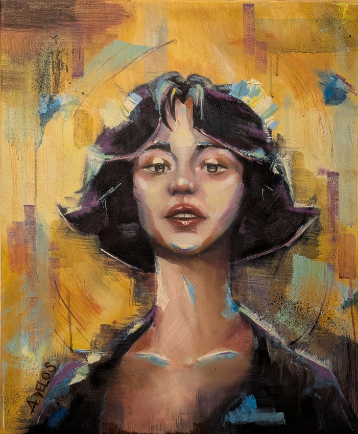 Retrato femenino de carácter íntimo sobre un fondo lleno de color y expresividad. La luz vira en diferentes tonalidades, resaltando las las facciones y silueta de la mujer, otorgándole en el proceso una unificación en trazos de colores a la obra.