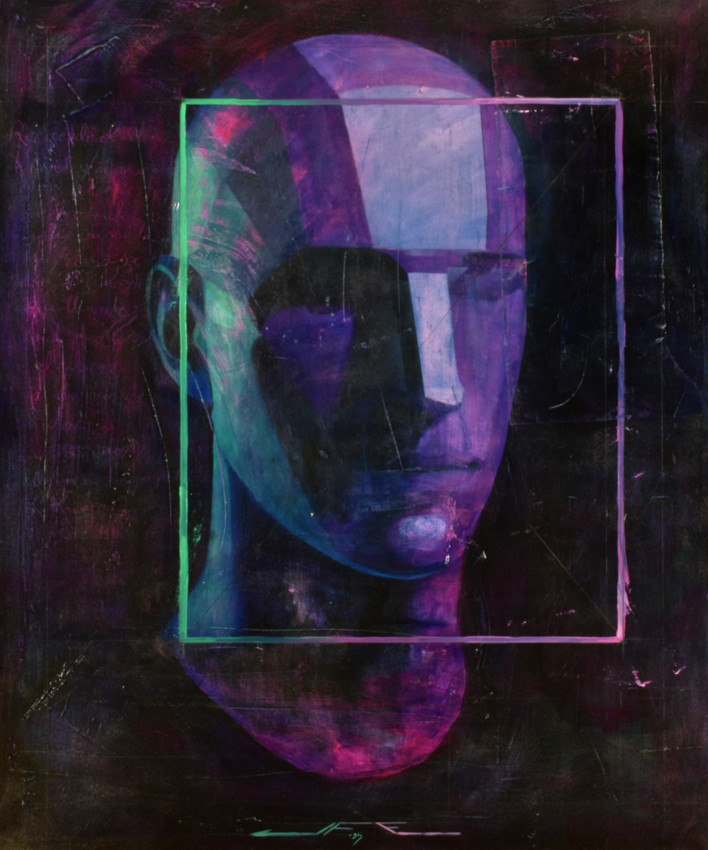 Inspirado por la primera copla de Jorge Manrique, el cuadro invita a una meditación visual sobre el tiempo, la muerte y la conciencia. La figura central, una cabeza esquemática de geometría sencilla y mirada detenida, emerge entre contrastes de luces dramáticas y colores oscuros con acentos flúor. La copla original está escrita a mano en el margen izquierdo del lienzo, anclando el sentido literario de la obra. Un rectángulo inscrito en proporción áurea estructura la composición, sutil pero firme, como una metáfora de orden dentro del devenir caótico del alma que despierta.