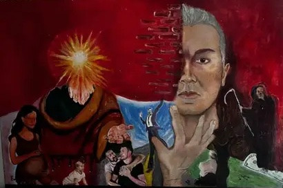 Explora la fractura entre identidad y memoria: un rostro dividido entre lo íntimo y lo simbólico, rodeado de escenas que evocan dolor, deseo y transformación. La obra sugiere un viaje interior donde el pasado se reconfigura y el yo se reconstruye desde sus propias ruinas.