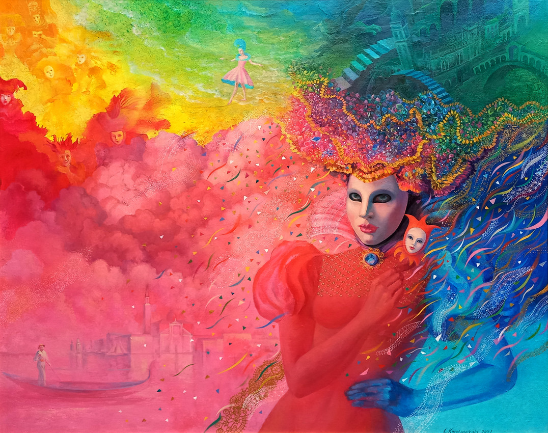 Venice is a city of amazing beauty and some kind of tragedy that is in the air here. All the year round the city attracts romantics from all over the world. Everyone knows about the Venice Carnival. More than half a million connoisseurs come to admire this miracle every year. This magical atmosphere of a medieval holiday is full of mysterious traditions and symbolism. For two weeks before Lent, Venice is filled with bright masks, carnival costumes, music and laughter, heaps of confetti, special rituals, original culinary traditions, fancy-dress dinners with theatrical performances. With her painting, Lana expressed love for beautiful Venice and its wonderful holiday.