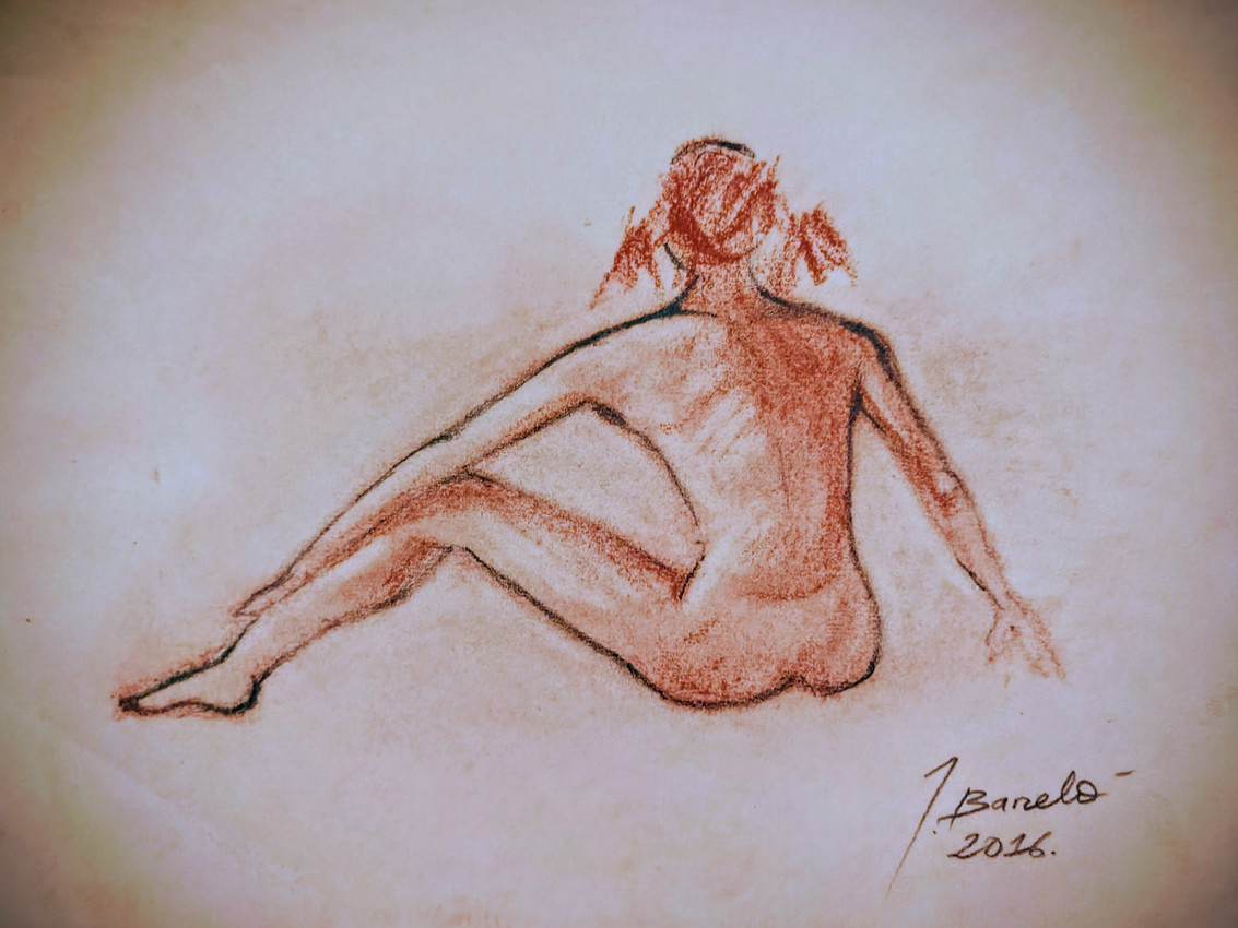 Se trata de un dibujo de una mujer que mira de espaldas al público al horizonte por decir algo.