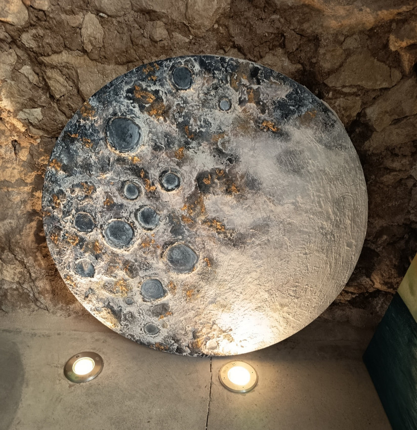 Esta obra original es una exploración de la luz y el relieve. Utilizando técnicas de textura en alto relieve, he recreado la superficie cratérica de la luna, dándole una presencia tridimensional que cambia según la iluminación de la sala. La aplicación de hoja de oro (pan de oro) aporta un brillo metálico sofisticado, creando un contraste único entre la sobriedad del fondo y la calidez del metal precioso.