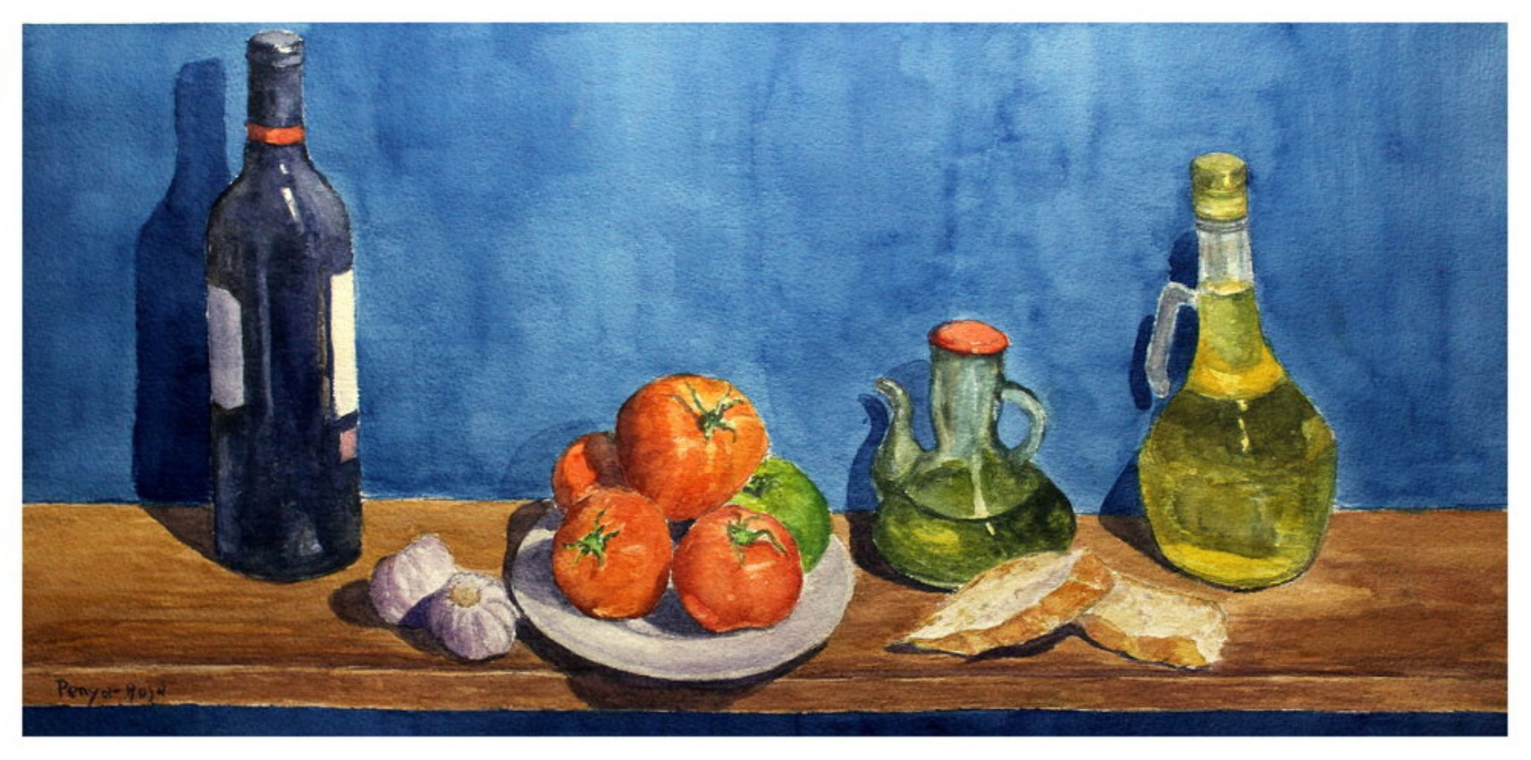 Esta obra está realizada en técnica de acuarela sobre papel Arches, empleando una paleta que destaca por su precisión y frescura. El artista Vicent Penya-Roja captura con gran detalle elementos típicos de la naturaleza muerta, utilizando recursos del impresionismo y realismo para resaltar la textura y la luminosidad de las frutas y botellas. La pieza data de 2015 y refleja el cuidado trabajo artesanal y el dominio técnico del autor.