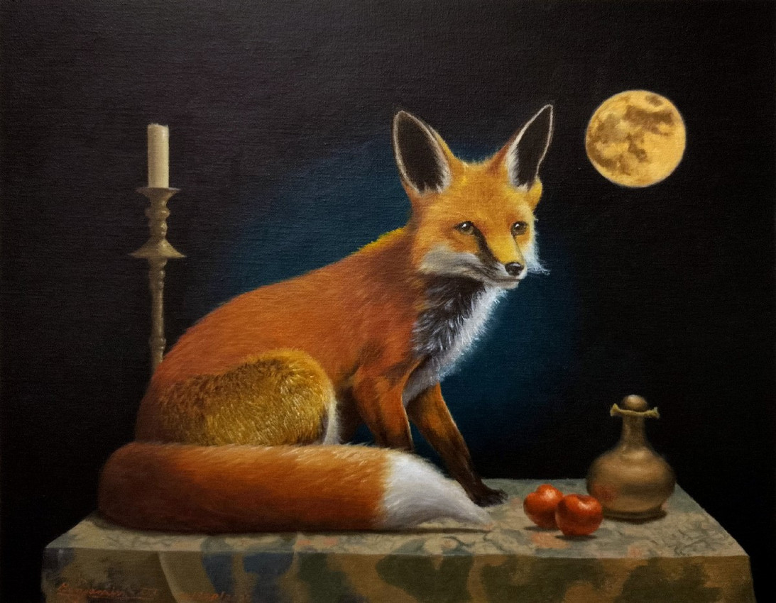 Una pieza única que muestra una composición de naturaleza muerta donde un zorro esconde algo.