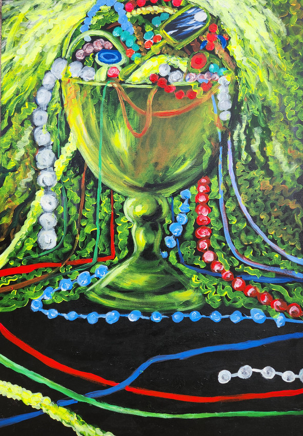 The painting depicts a vessel overflowing with gold and jewels — a symbol of material wealth and splendor. Yet, within it lies a mirror reflecting the sky, infinite and ethereal. The contrast between the golden brilliance and the serene reflection of the heavens evokes a tension between earthly desire and spiritual longing. The artwork invites reflection on what true richness means — the treasures we hold in our hands, or the light we glimpse in the sky.