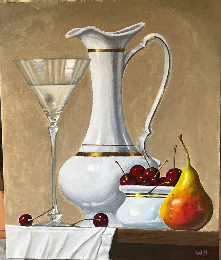 Obra realista que representa un bodegón compuesto por una jarra y una copa de cristal junto a frutas frescas. La composición juega con la luz natural y los reflejos sobre las superficies blancas y doradas, transmitiendo serenidad y equilibrio.