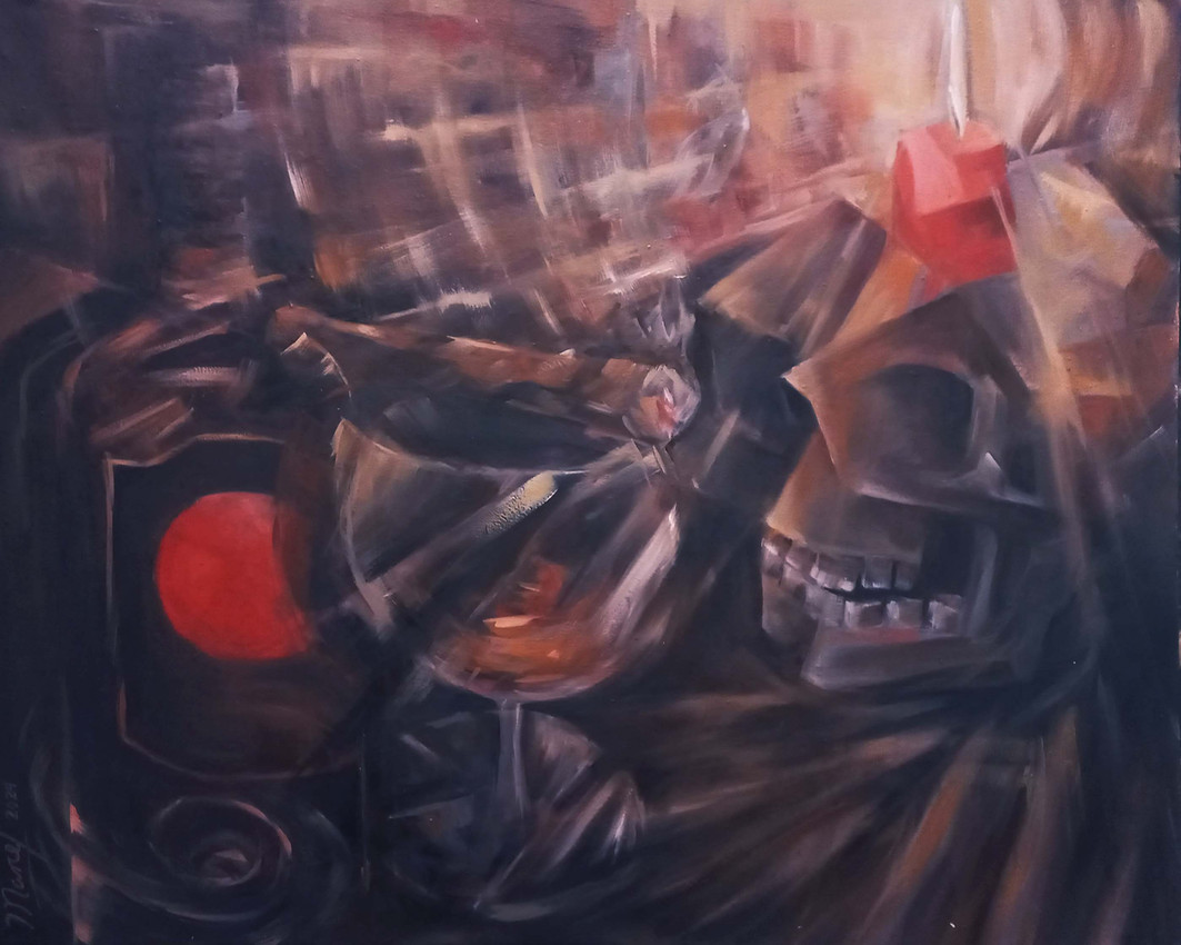 En esta obra, las sombras se mezclan con destellos cálidos para componer una danza inquietante entre placer y muerte. Una calavera, rígida pero casi sonriente, observa desde la penumbra mientras un puro arde lentamente y un vaso de licor refleja el ámbar líquido como fuego atrapado en cristal. Los trazos son veloces, difusos, como si el tiempo se estuviera desintegrando ante nuestros ojos. El rojo intenso, aquí y allá, rompe la oscuridad como una advertencia: lo efímero del goce, la inminencia de lo inevitable. Es una vanitas moderna que huele a tabaco, a ron y a destino.