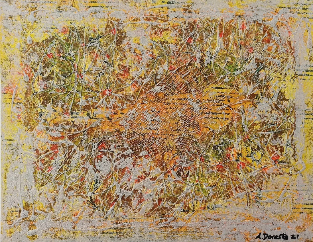 Este cuadro presenta una composición abstracta rica en texturas a base de redes superpuestas y colores cálidos. Predominan los tonos amarillos, ocres y verdes, con acentos de rojo y blanco que atraviesan la superficie en forma de líneas y manchas enérgicas.