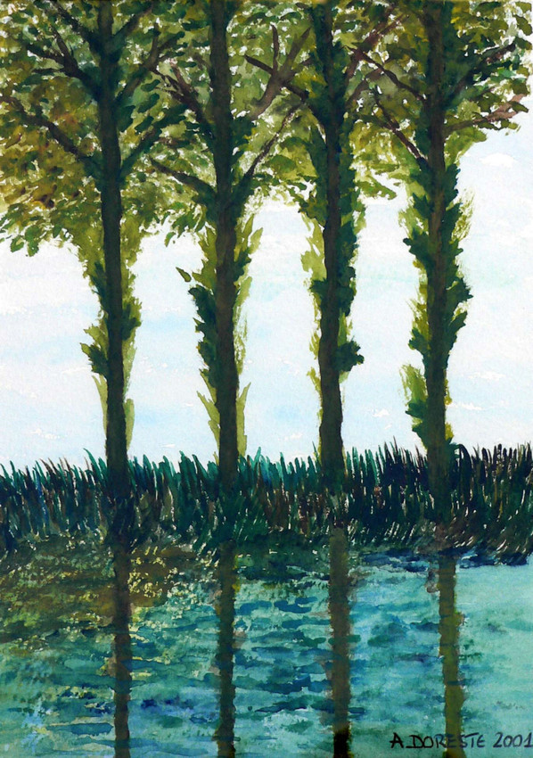 Esta obra es una pintura que muestra cuatro álamos erguidos a orillas del agua. Los troncos verticales se reflejan en la superficie azulada, que transmite calma y frescura. La parte superior de los árboles está cubierta de frondoso follaje verde, que filtra la luz y genera un contraste con el cielo claro del fondo. En la base, una franja de hierbas y matorrales en tonos verdes oscuros acentúa la profundidad de la escena.