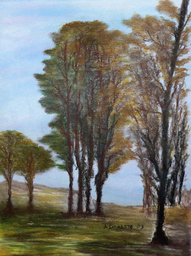 Este cuadro muestra un paisaje natural en el que predominan los árboles altos y esbeltos, con copas que mezclan tonos verdes, marrones y dorados, sugiriendo el final del verano o inicios del otoño. El cielo claro, en tonos azulados y suaves, aporta serenidad y contrasta con las sombras proyectadas sobre el suelo, que se ve cubierto de hierba en distintas gamas de verde. La composición transmite calma y cierta melancolía, como una escena detenida en el tiempo.