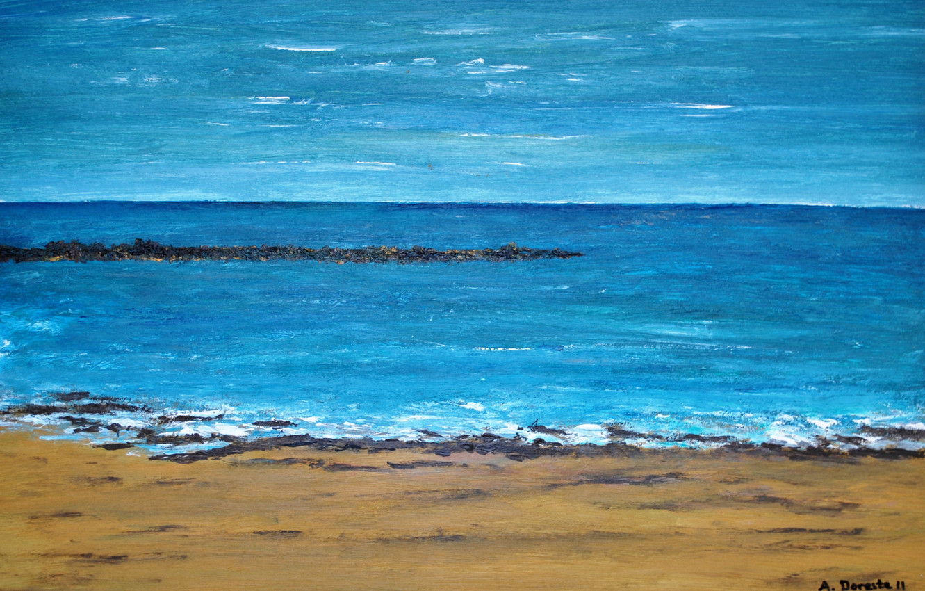 Este cuadro muestra un paisaje marino de gran serenidad. En primer plano, la arena dorada de la playa está matizada con tonos oscuros que sugieren piedras mojadas o restos de algas. Justo detrás, el mar se extiende en diversas tonalidades de azul, con pinceladas que evocan el movimiento suave de las olas rompiendo en la orilla. Más al fondo, se distingue una línea oscura que podría representar rocas o un arrecife. El cielo, pintado con azules claros y pinceladas blancas, transmite calma y amplitud, fundiéndose suavemente con el horizonte.