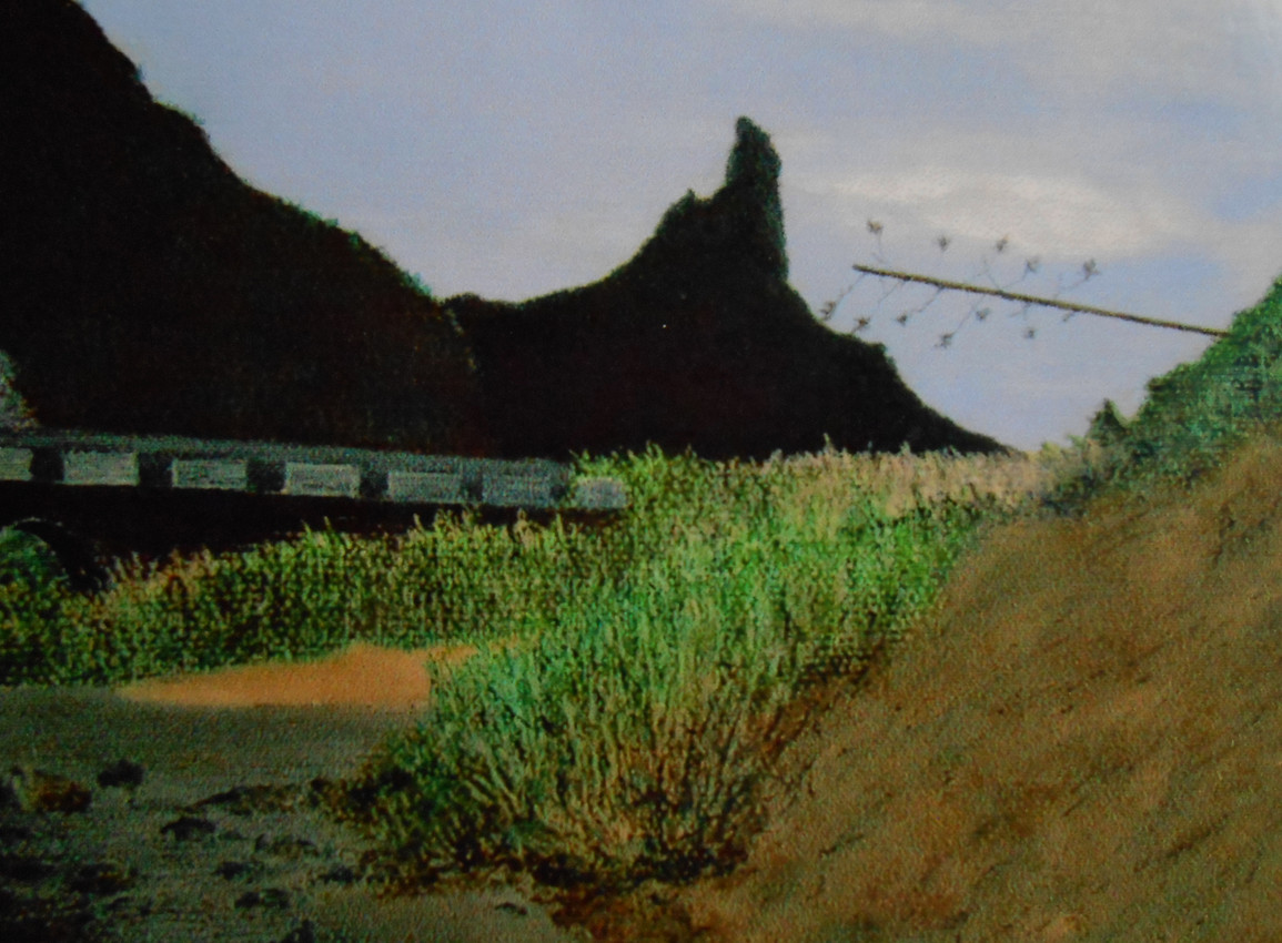 La pintura, al pastel, muestra un paisaje característico del interior montañoso de Gran Canaria, donde el Barranco de Tejeda se abre paso entre laderas abruptas cubiertas de vegetación silvestre. En el horizonte, destaca la silueta imponente del Roque Bentayga, un monumento natural que se eleva majestuoso como guardián del valle. El cielo, de tonos suaves y luminosos, contrasta con las sombras oscuras de las montañas, creando un equilibrio entre serenidad y fuerza.