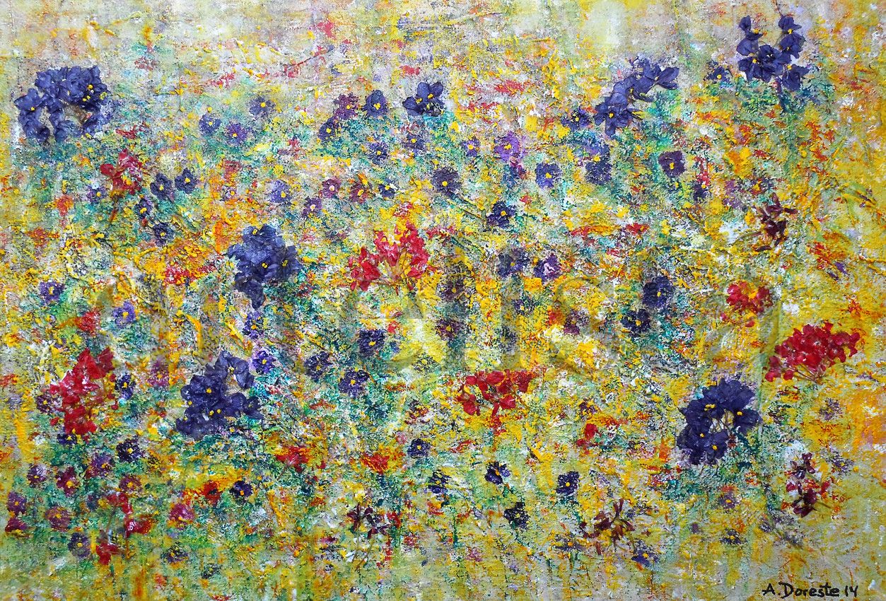 Este cuadro es una explosión de color que transmite la vitalidad de un campo en plena primavera. Con pinceladas gruesas y texturizadas, la obra evoca un prado lleno de flores en donde predominan los tonos amarillos, verdes y rojos, acompañados de acentos violetas que aportan contraste y profundidad. La técnica parece cercana al impresionismo moderno, con un estilo libre y casi abstracto que sugiere movimiento, como si el viento recorriera la pradera.