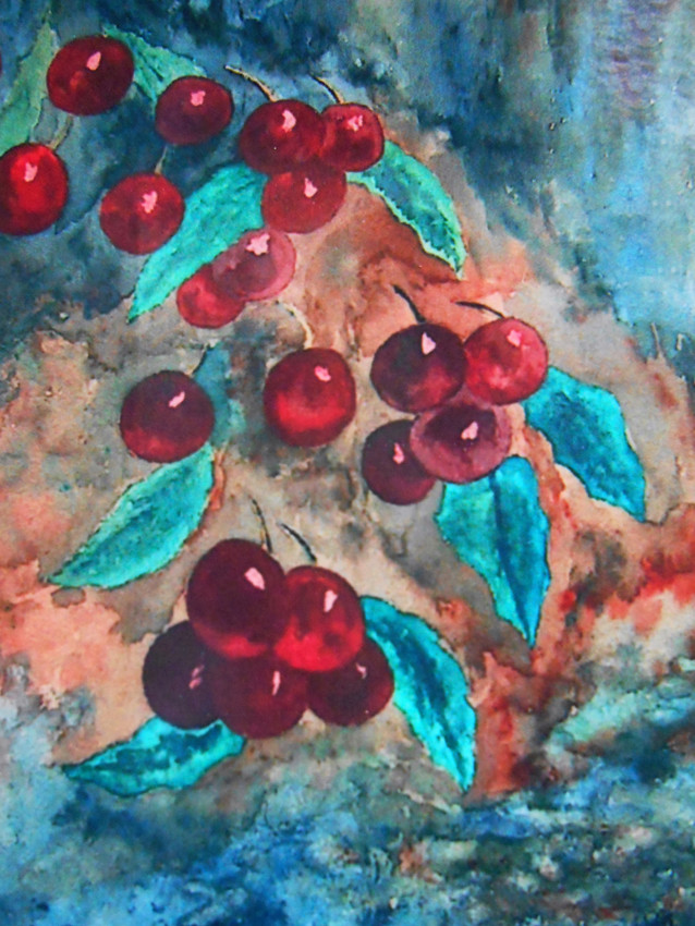 La imagen muestra una pintura con un estilo expresionista que representa un racimo de cerezas rojas brillantes, acompañadas de hojas verdes con matices azulados. El fondo tiene una mezcla de colores terrosos, naranjas y azules que generan un contraste vibrante con los frutos, transmitiendo energía y vitalidad. Las cerezas parecen resaltar como protagonistas, mientras el fondo sugiere un ambiente natural y dinámico, casi abstracto.