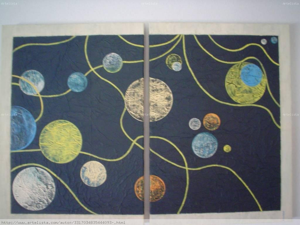 Cuadro Abstracto de sentido decorativo, realizado con pintura acrilica sobre papel mache, fondo oscuro con figuras circulares de tonalidades claras y esfumadas. La idea general es dar una sensacion de flotabilidad espacial y sinuosidad. La obra esta realizada en 2 lienzos de 70 x 50 cm, los cuales se cuelgan con una separacion de entre 2 y 3 cm con efecto de continuidad