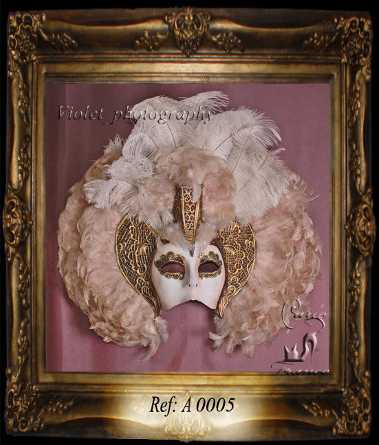 Máscara confeccionada a mano con estaño policromado con pan de oro, plumas de avestruz albina y plumas de cisne beige
