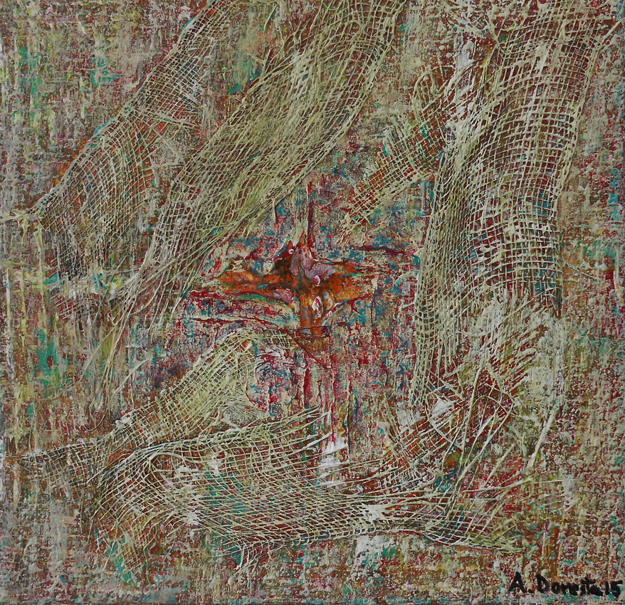 Se distinguen varias capas de texturas sobrepuestas: una base multicolor con predominio de tonos rojizos, verdes y azulados, cubierta por formas que recuerdan mallas o telas desgastadas, aplicadas en trazos diagonales que parecen fluir como corrientes o velos en movimiento. En el centro se observa una mancha más densa, rojiza y anaranjada, que rompe con la armonía de las texturas, convirtiéndose en un foco de tensión visual.