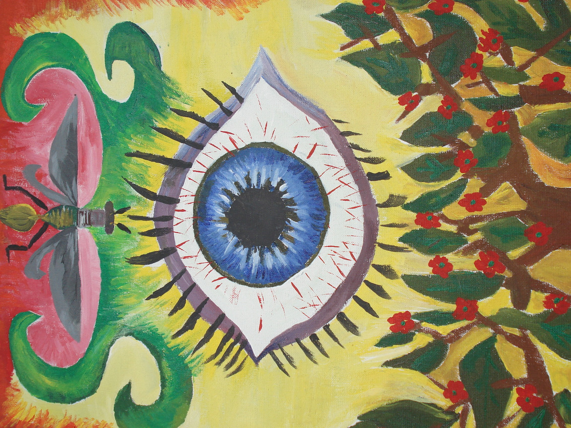 Es acrílico sobre cartón entelado 27x35. Es mi segunda obra, me gusta pintar ojos...y el nombre se me acaba de ocurrir.