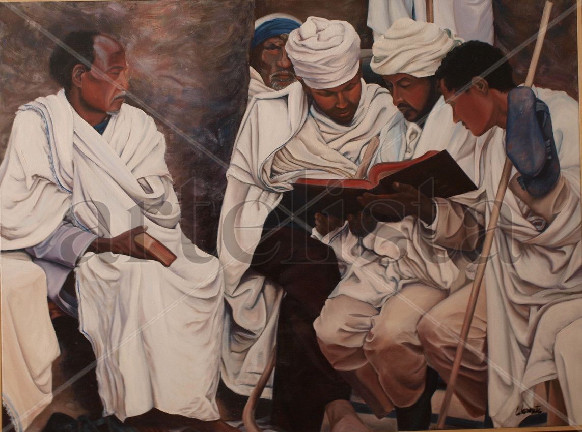 Escena costumbrista, que representa la lectura de la Biblia por una comunidad cristiana del norte de África.