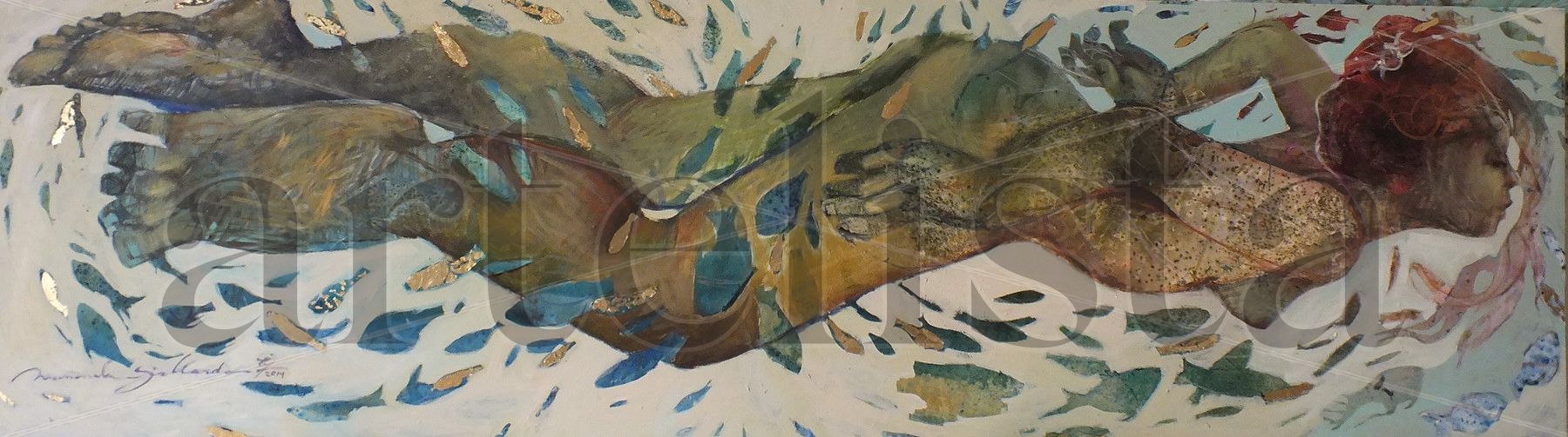 De la serie de las nadadoras. La figura aparece a trabes de la técnica de inversión de figura y fondo, donde los principios de la obra son prácticamente un cuadro abstracto. La figura tiene distorsiones y amplificaciones en los pies y las manos, rasgos propios de la autora.Los peces en su conjunto forman un ritmo que forman un infinito y se alternan con dorados que desprenden destellos según la luz del dia y el angulo de donde se observe la obra.